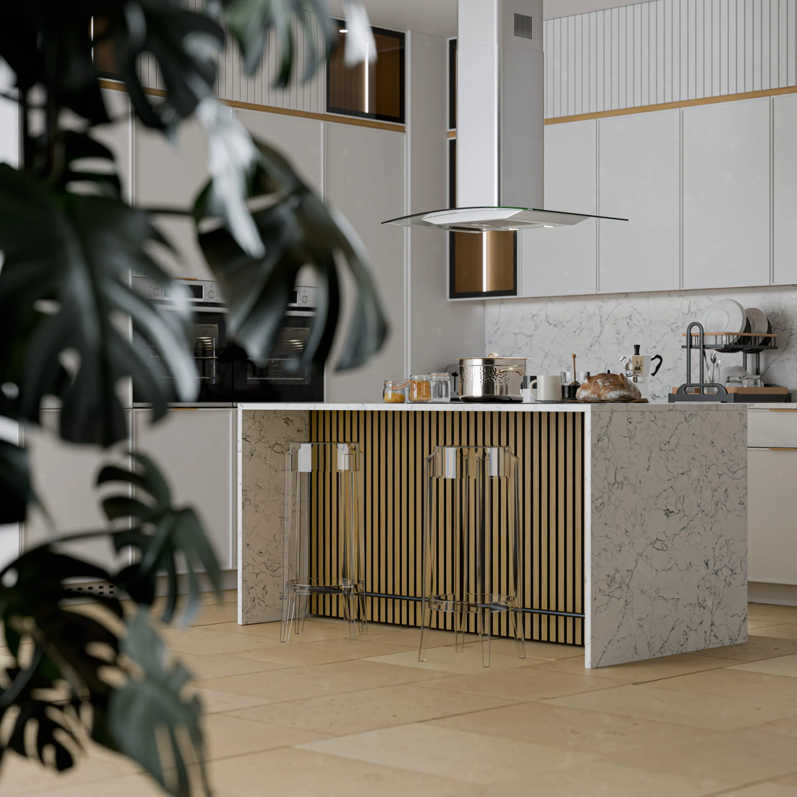 Le blanc, le marbre et le bois de cette cuisine ouverte est le combo gagnant du style minimaliste.
