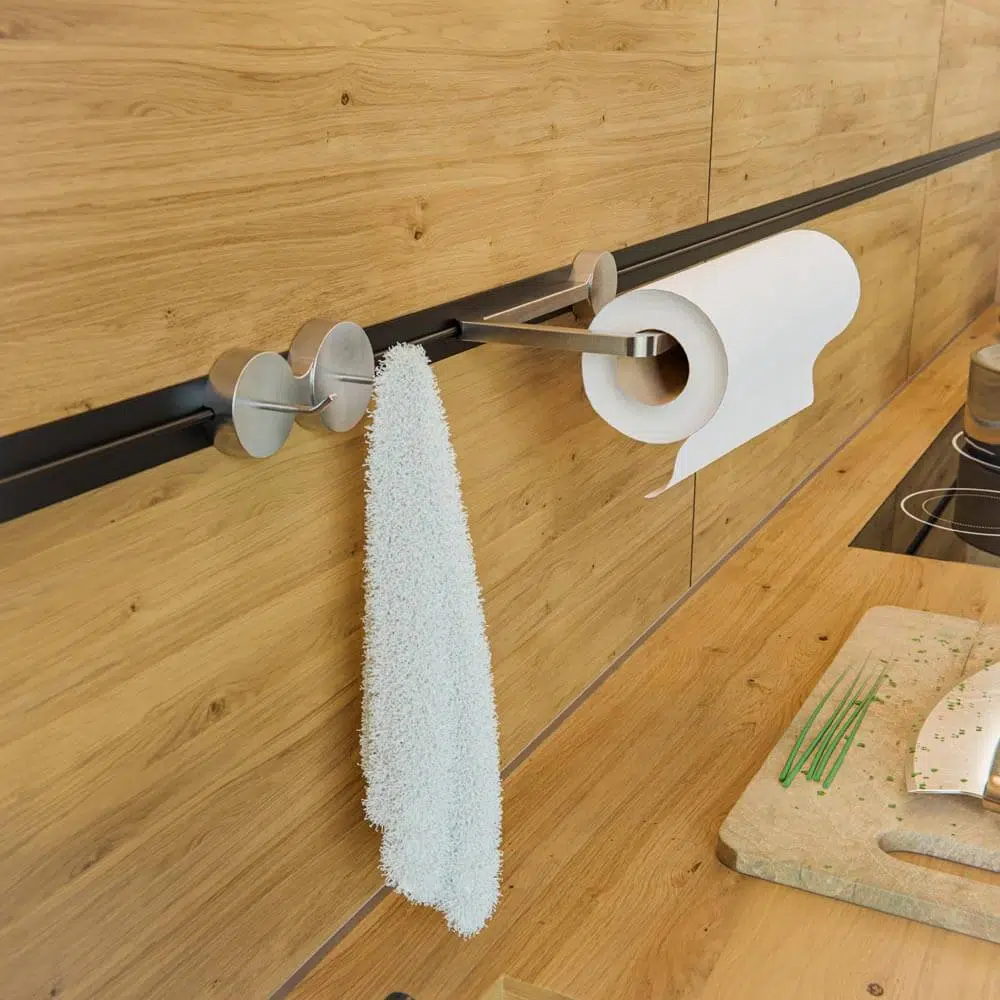 Les accessoires compatibles se clipsent sur le listel décoratif et peuvent être repositionnés à l’infini. Un système de blocage leur permet de supporter des charges jusqu’à 5 kg.