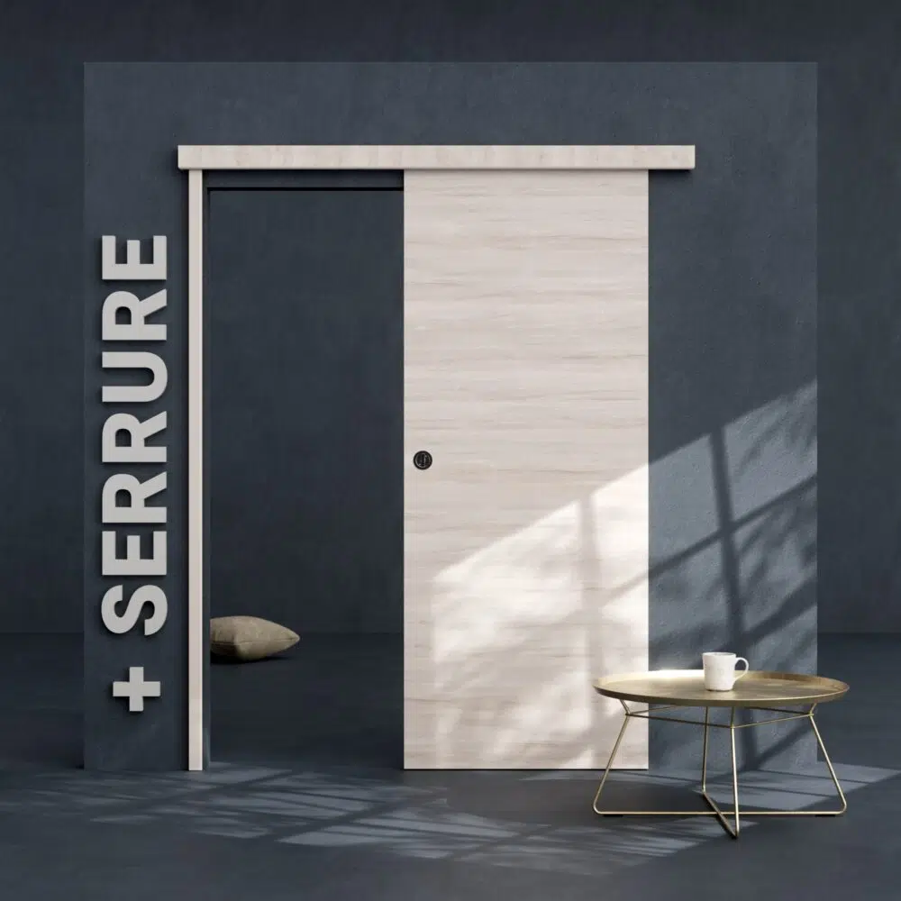 Le kit porte coulissante avec serrure contient un rail breveté Coulicool ainsi que des amortisseurs invisibles et silencieux. Sur le marché depuis plus d’une décennie, le rail coulissant permet une ouverture fluide de la porte. Avec les cales de pré-positionnement pour le fixer au mur, il s’installe rapidement. Pour le cacher, vous trouverez également dans le kit un cache-rail du même décor que celui de la porte Oslo.