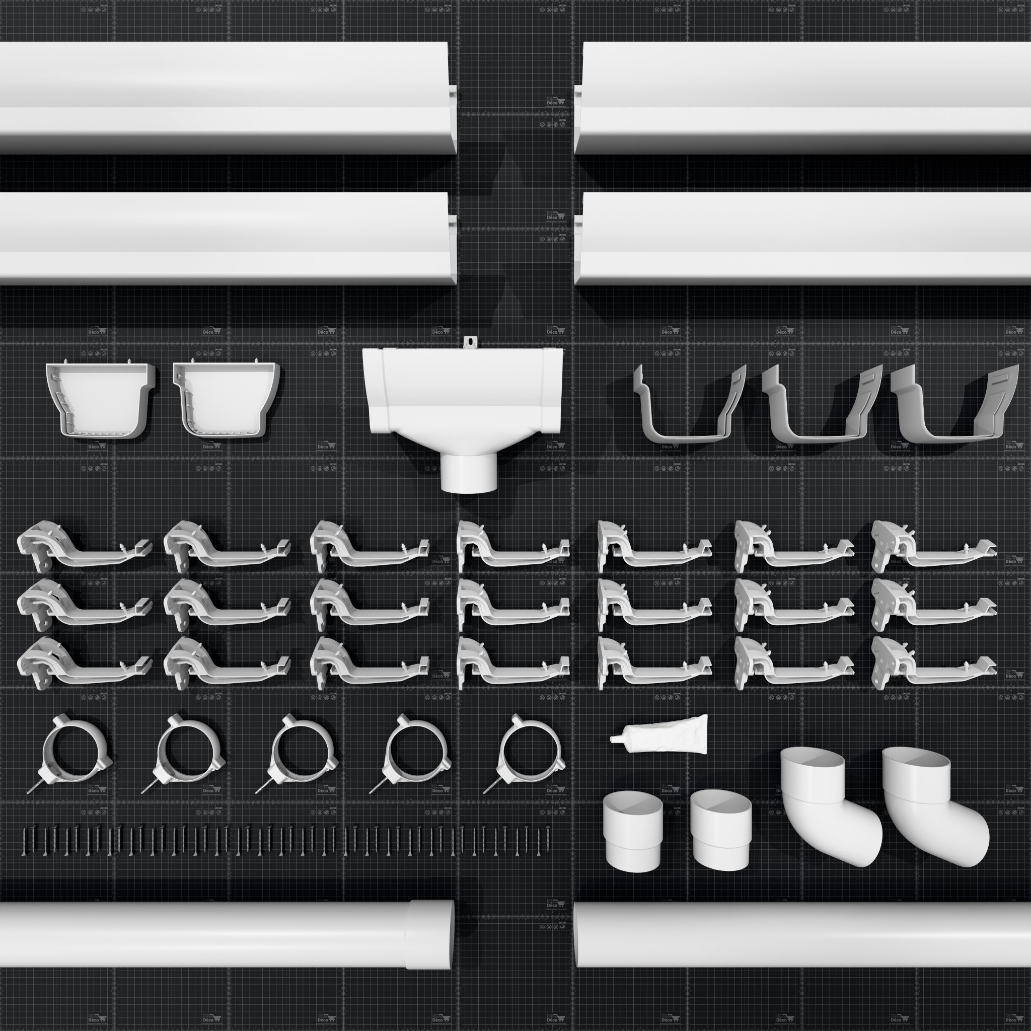 Collier de fixation [x5], Coude 67° [x2], Crochet de fixation [x21], Fond de gouttière, Gouttière 2 m [x4], Jonction [x3], Manchon [x2], Naissance centrale [x1], Tube de colle [x1], Tuyau de descente 2 m [x2], Vis inox torx [x50]