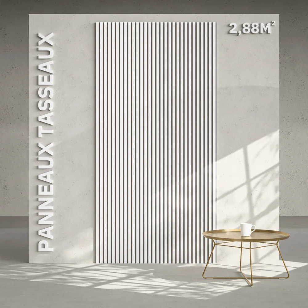 Idéals pour décorer un mur, un plafond ou créer un soubassement, les panneaux tasseaux bois full blanc apportent un côté sophistiqué et tendance à vos espaces de vie comme de travail. Les tasseaux mélaminés sur les 3 faces font du panneau acoustique mural décoratif un revêtement qui allie qualité et performance.