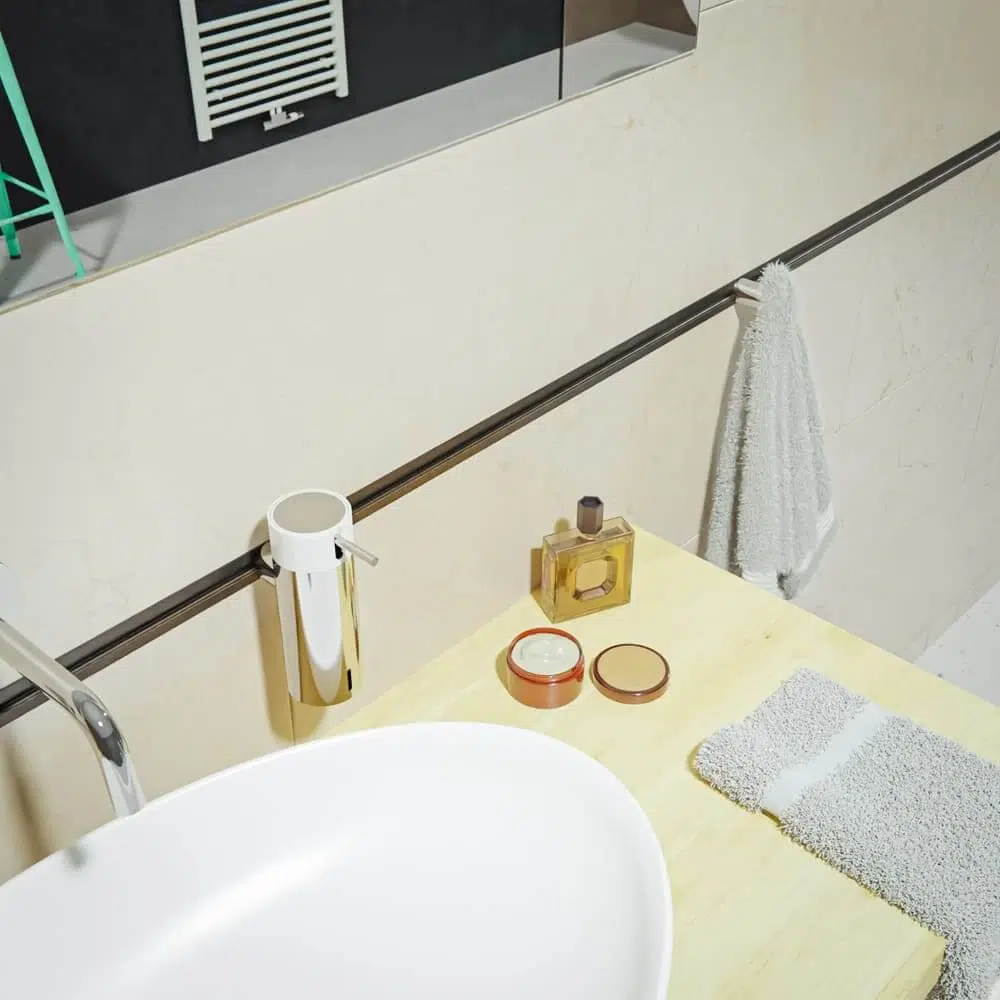 Les accessoires compatibles se clipsent sur le listel décoratif et peuvent être repositionnés à l’infini. Un système de blocage leur permet de supporter des charges jusqu’à 5 kg.