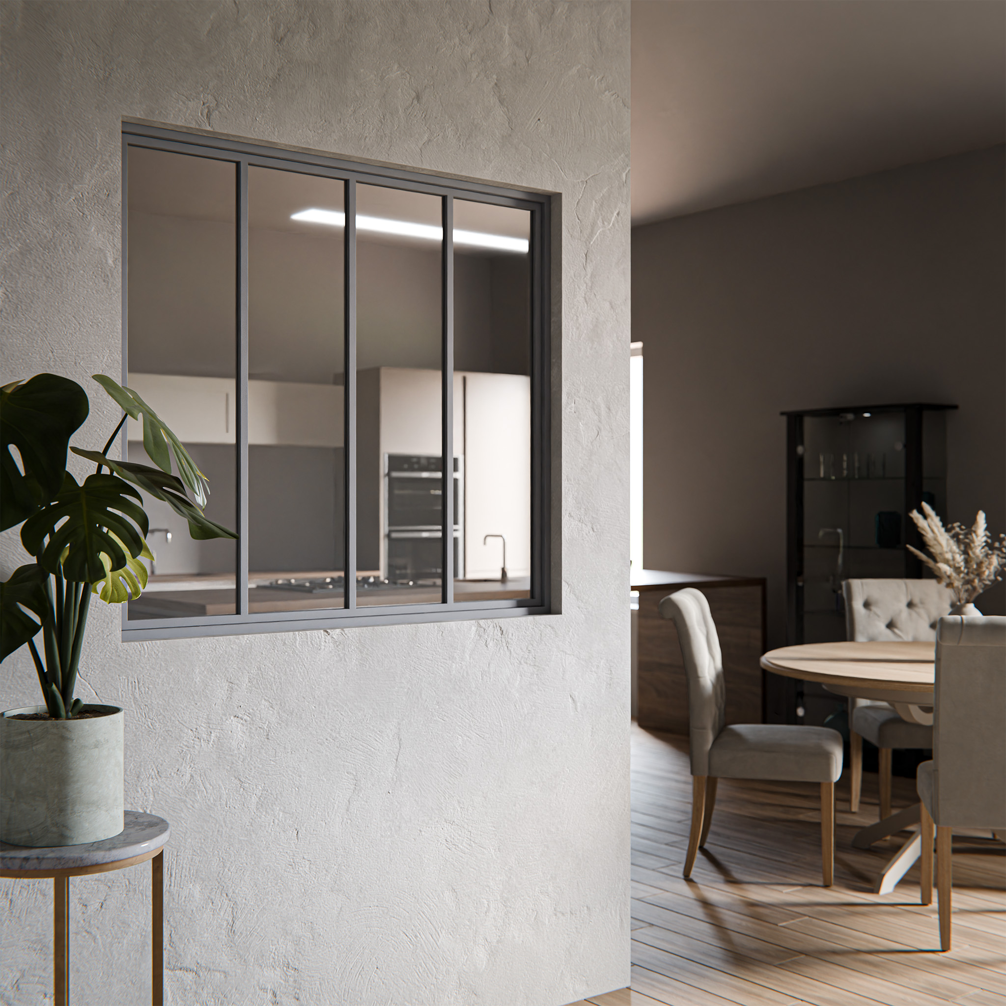 Disponible en acier gris ou noir mat, de 2 à 5 carreaux, en verre transparent ou dépoli, elle offre une multitude de possibilités. Elle peut être utilisée de façon à séparer le coin cuisine du séjour, délimiter une entrée, offrir de l’intimité à une pièce d’eau ou à aménager un espace bureau.